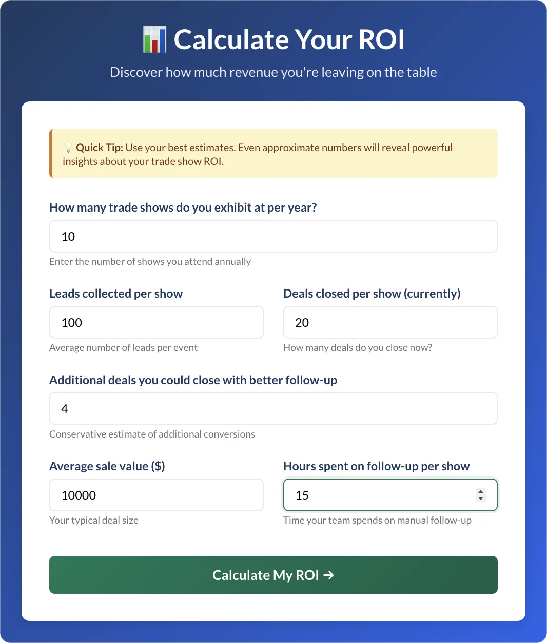 When Shane saw how Exhibitor Follow Up Pro works, he did the math. The leads that went cold during his 30-40 hours of manual data entry. The warm prospects who never got followed up with because his team was focused on "hot" leads. The deals that slipped through the cracks because follow-up happened 3-5 days after the show instead of 5 minutes after the conversation.