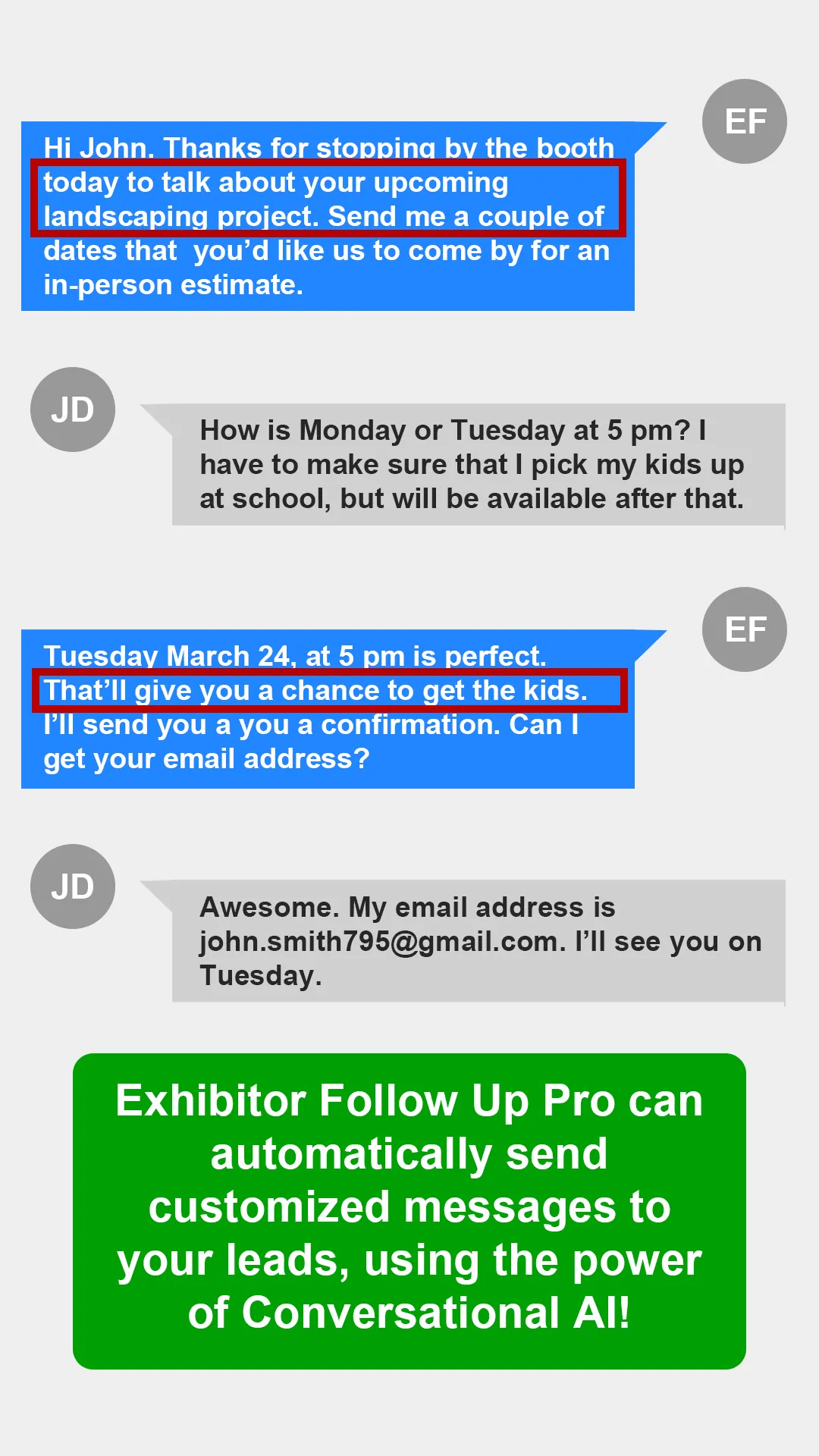 Look at this conversation. That’s not a person, that’s Exhibitor Follow Up Pro casually guiding a lead toward booking a appointment.
